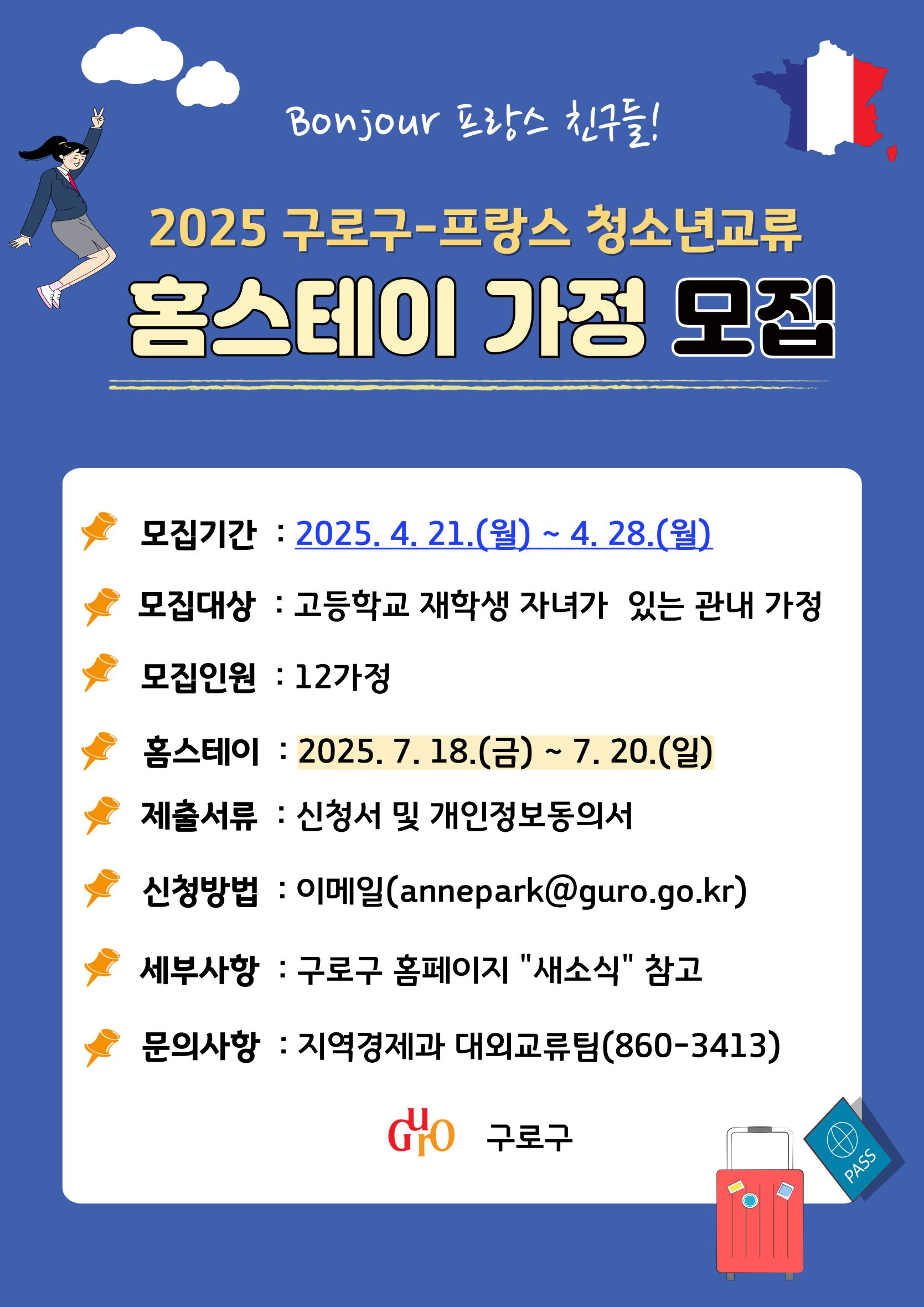 구로구는 프랑스 이씨레물리노시 청소년들을 위한 홈스테이 프로그램에 참여할 지역 가정을 오는 4월 21일부터 28일까지 모집한다고 밝혔다. 이번 프로그램은 2008년부터 지속되어온 구로구-이씨레물리노시 간 청소년 교류의 일환으로, 상호 방문을 통해 양국 청소년의 우정을 쌓고 문화를 직접 체험하는 것을 목표로 한다.