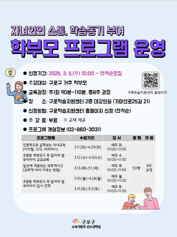 구로구는 오는 12월까지 구로학습지원센터에서 ‘2025년 학부모 프로그램’을 운영한다. 이 프로그램은 관내 학부모를 대상으로 자녀 교육에 대한 고민을 해소하고, 학습 지도에 도움이 되는 정보를 제공하기 위해 기획되었다. 주요 강좌는 ▲인문학으로 살펴보는 자녀교육 ▲일상에 적용되는 과학적 사고 ▲초·중등 학부모가 꼭 알아야 할 교과과정 및 입시·독서·진로 전략 등으로 구성된다.