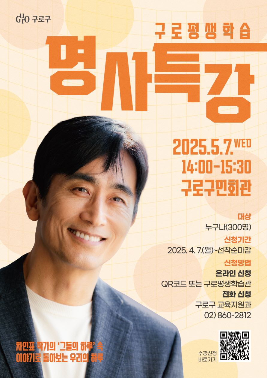 이번 특강은 선착순 300명을 대상으로 하며, 4월 7일(월)부터 신청을 받는다. 구로평생학습관 누리집 또는 홍보 포스터에 포함된 QR 코드를 통해 온라인 신청이 가능하며, 인터넷 사용이 어려운 경우에는 구청 교육지원과(02-860-2812)로 전화 신청도 받을 예정이다. 누구나 무료로 참여할 수 있다.