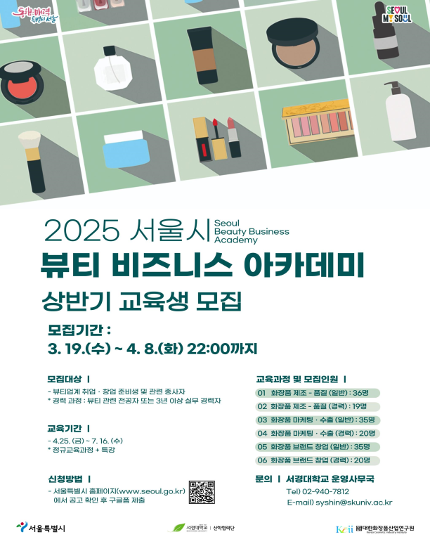 서울시가 K-뷰티 산업을 선도할 전문 인력 양성을 위해 2025년 상반기 ‘뷰티 비즈니스 아카데미’ 교육생을 모집한다. 이번 교육은 4월 25일부터 7월 16일까지 약 3개월간 진행되며, 신청은 4월 8일(화)까지 서울시 누리집을 통해 가능하다.