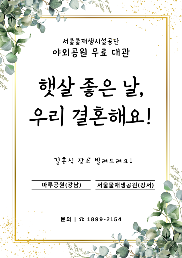 서울시 산하 서울물재생시설공단이 결혼을 앞둔 예비부부들을 위해 강남구와 강서구에 위치한 야외공원 두 곳을 무료로 대관해주는 사업을 시작했다. ‘햇살 좋은 날, 우리 결혼해요’라는 슬로건 아래 진행되는 이번 프로그램은 마루공원(강남)과 서울물재생공원(강서)에서 진행되며, 3월부터 6월, 8월부터 11월까지 매주 토요일 예식이 가능하다. 대관료는 전액 무료이며, 예식 공간을 꾸미는 데 필요한 의자와 테이블 등의 비품 운영비도 서울시가 최대 100만 원까지 지원한다.